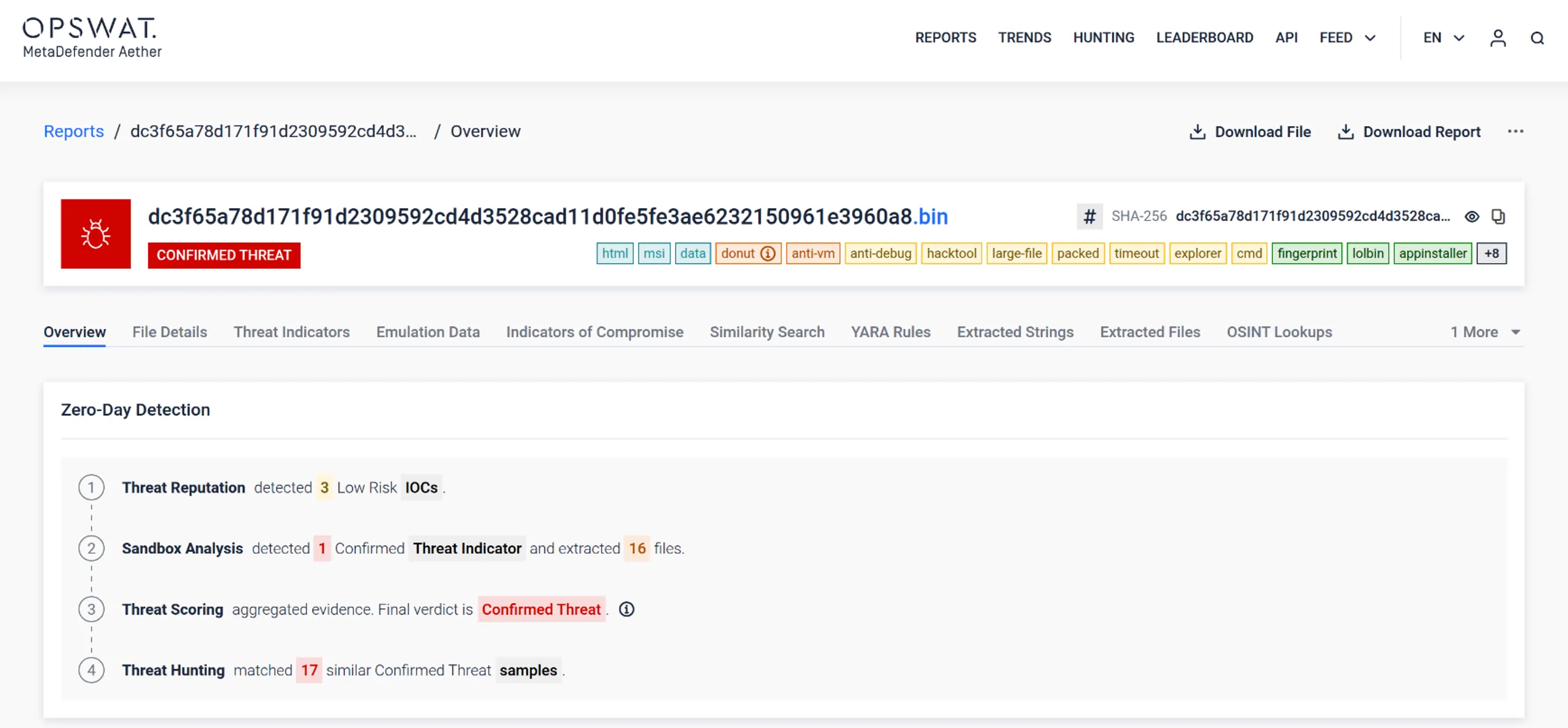 MetaDefender Aether™ 3.0.0, OPSWATyeni nesil birleşik sıfırıncı gün saldırı tespit çözümüdür.Sandbox kanıtlanmış yeteneklerini yerleşik tehdit istihbaratı, tehdit puanlama ve tehdit avcılığıSandbox birleştirir ve tüm bunları tek bir uyarlanabilir tespit boru hattı olarak sunar.