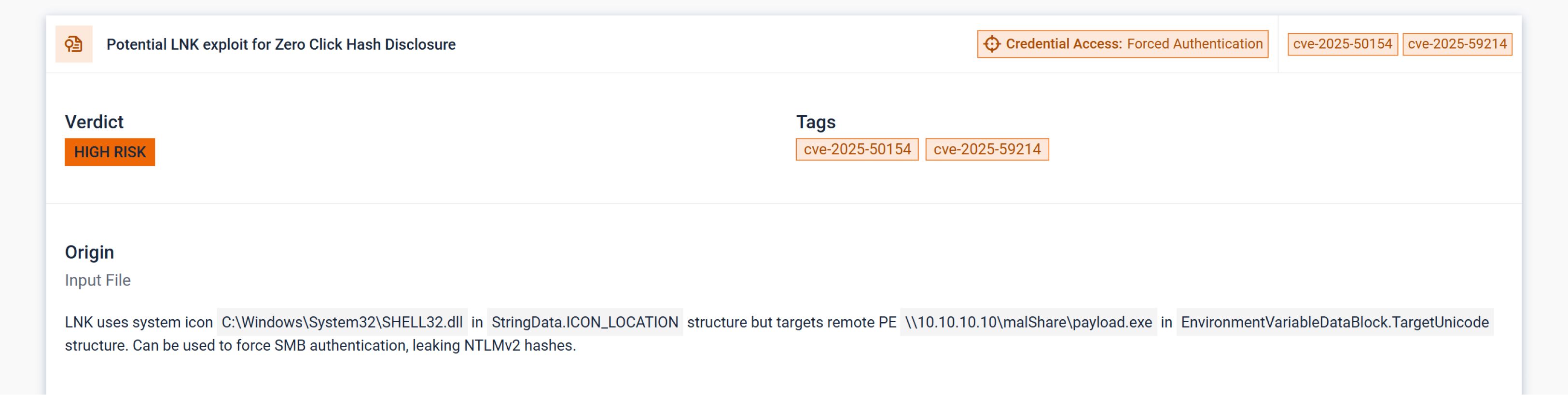 - Sıfır Gün Saldırı Tespiti - Kullanıcı etkileşimi olmadan NTLM kimlik bilgilerini sızdıran son Windows Explorer LNK güvenlik açıkları (CVE-2025-50154, CVE-2025-59214) için tespit eklendi. Ayrıca, Apache Tika'da kritik XXE istismarı (CVE-2025-66516) için tespit eklendi.